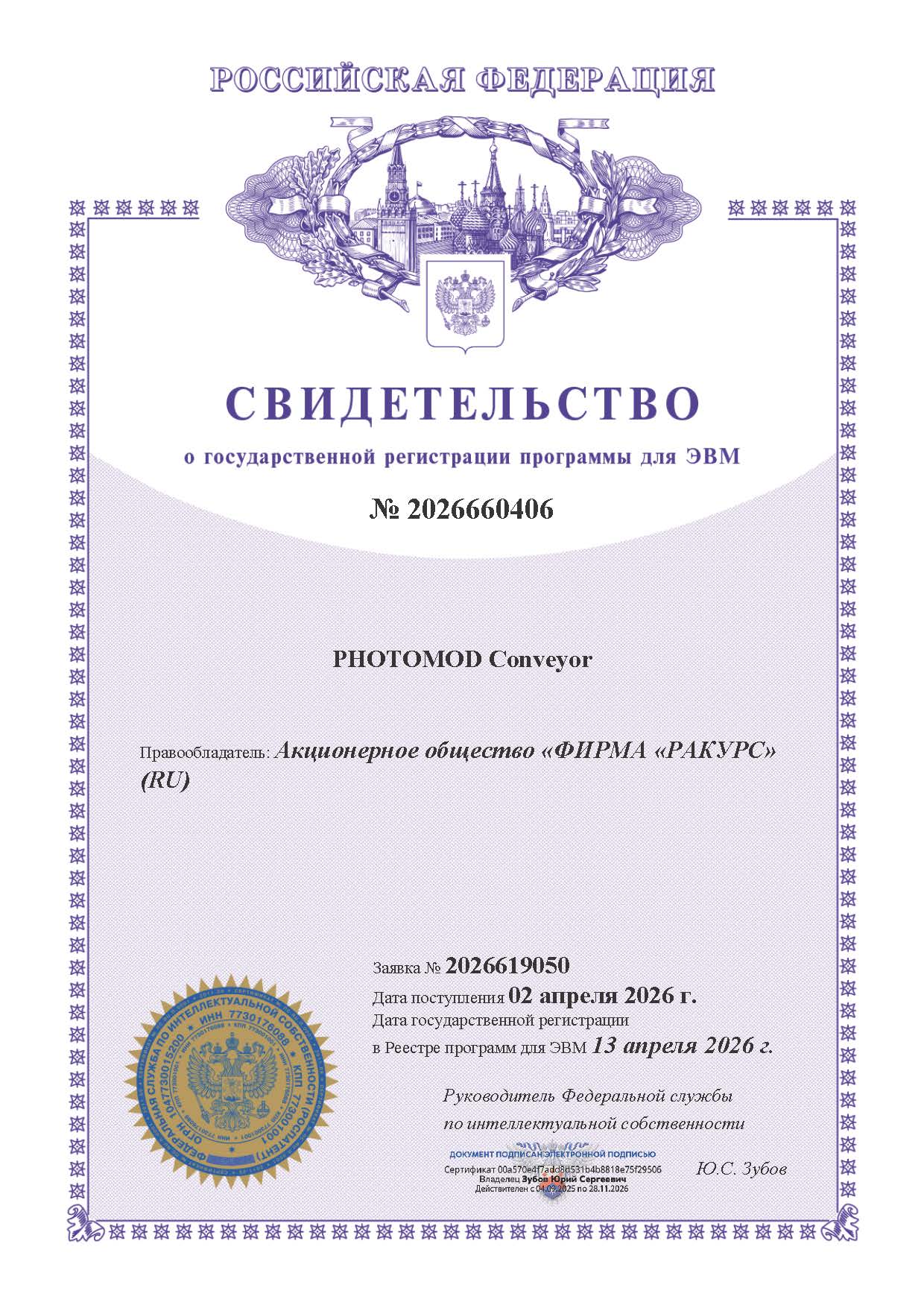 Свидетельство о государственной регистрации программы PHOTOMOD Conveyor для ЭВМ