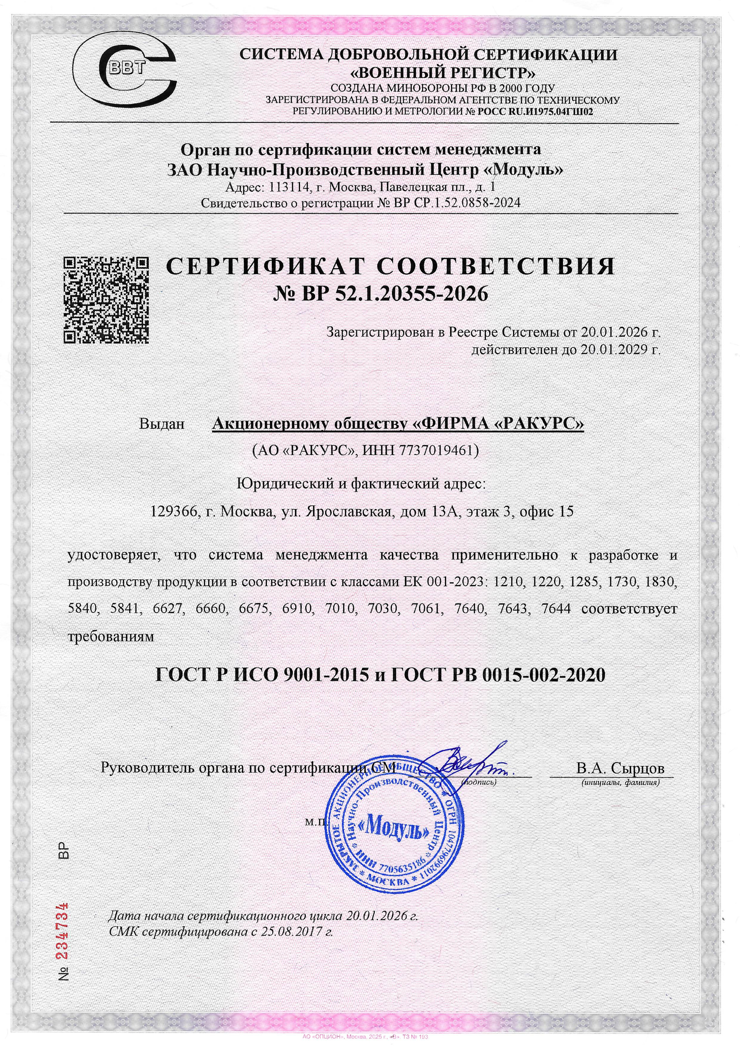 Сертификат соответствия системе менеджмента качества требованиям ГОСТ ИСО 9001–2015 и ГОСТ РВ 0015-002-2020 № ВР 52.1.20355–2026 от 20.01.2026 г.
