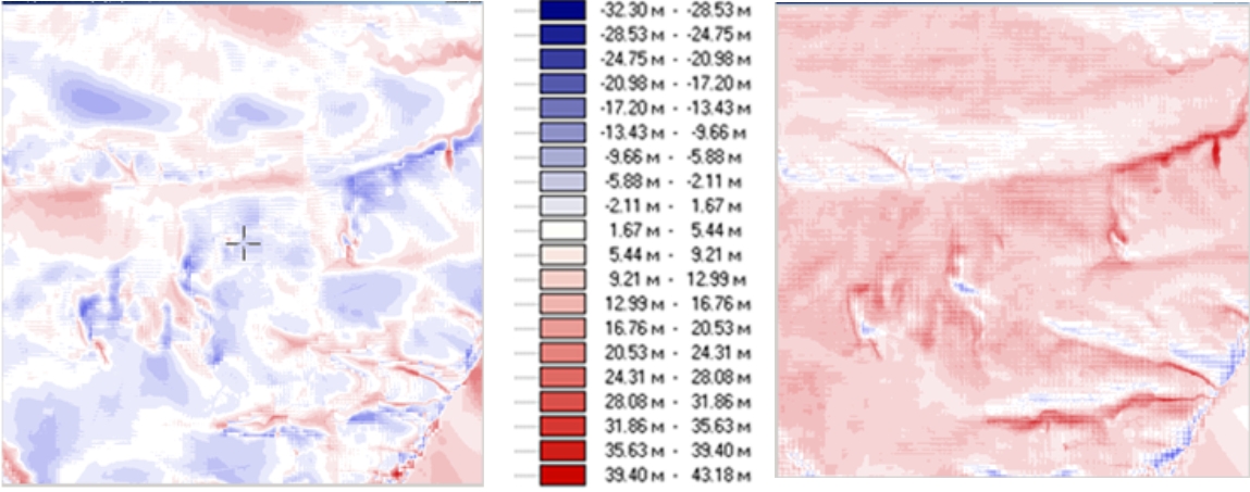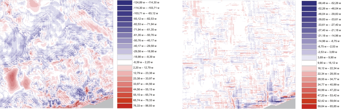 Рис.6. Результаты сравнения матрицы по карте 1:100 000 (слева) и тестовой, и SRTM и тестовой (справа) на район г. Сочи.