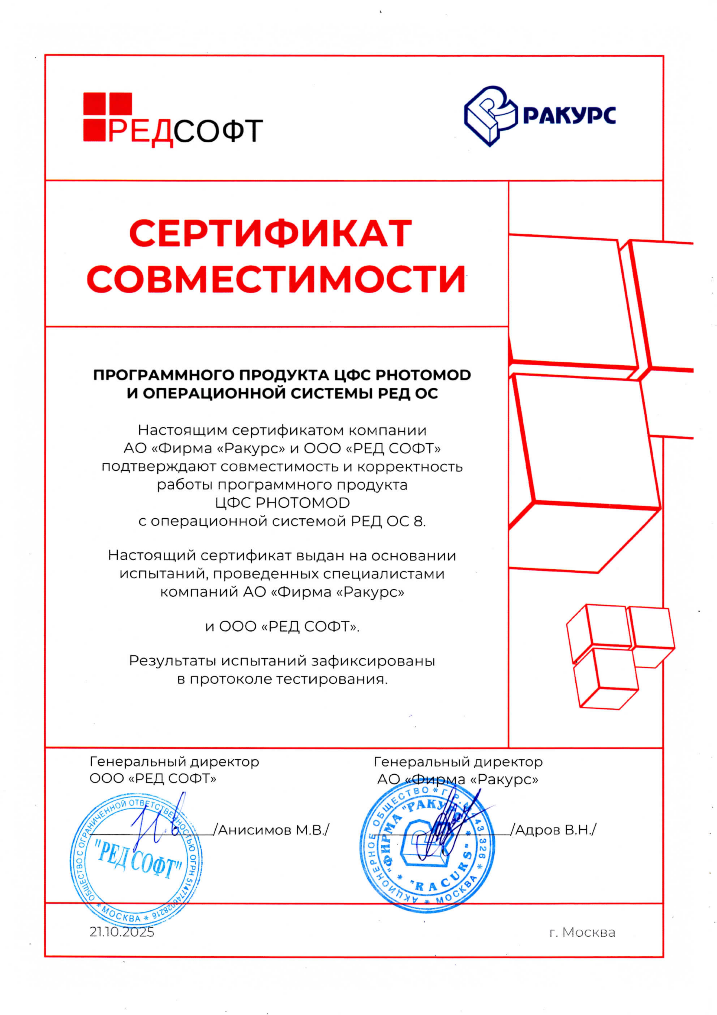 Цифровое фотограмметрическое программное обеспечение PHOTOMOD успешно прошло сертификационные испытания, подтверждающие работоспособность и корректность установки и совместного функционирования продуктов PHOTOMOD, PHOTOMOD UAS, PHOTOMOD AutoUAS, PHOTOMOD GeoCalculator в среде операционной системы РЕД ОС 8.0.2 в стандартной редакции конфигурации «Рабочая станция», о чем свидетельствуют сертификаты совместимости от 21.10.2025, выданные ООО «РЕД СОФТ».